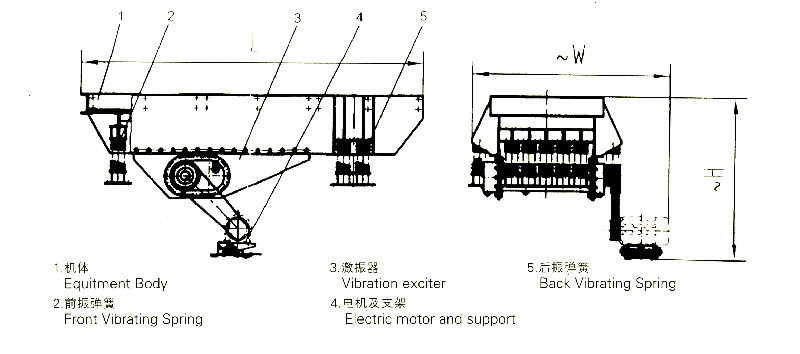 Vibrating feeder iscomposed of a feeding trough, vibrator, spring support, driving device, etc. Bodyvibration feeder vibration source is the vibration exciter, which is composedof two eccentric shaft (main, passive) and gear pair. Motor drives the drivingshaft through the belt, and the driving shaft gear driven shaft rotation. Thedriving shaft and the driven shaft reverse rotation at the same time, the bodyvibration, so that the material continuous flow, achieve the purpose ofconveying material.
