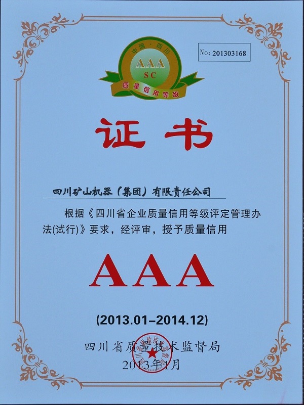 川礦集團公司日前,從省質檢局獲悉,四川礦山機器(集團)有限責任公司喜獲“四川省企業(yè)質量信用等級AAA級企業(yè)”稱號,并頒發(fā)了榮譽證書。
