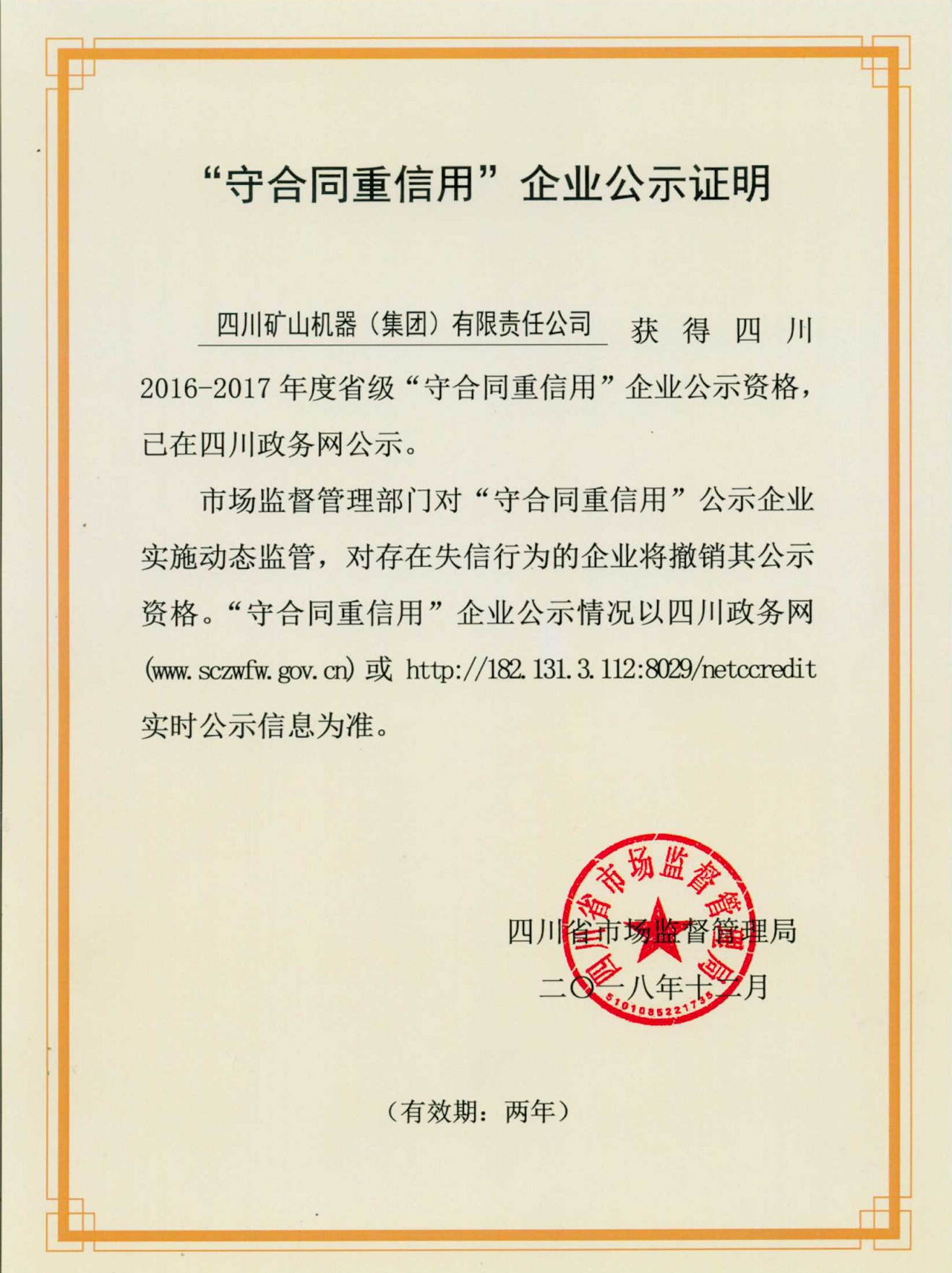 川礦集團獲得省級“守合同重信用”企業(yè)公示資格