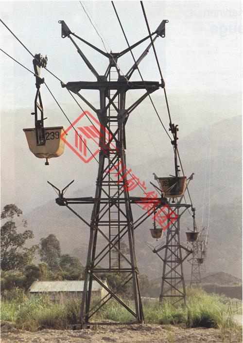 2、復線(支索、曳索各一)循環(huán)式貨運索道系統(tǒng):線上有一個支撐吊桶,另一曳索拖曳吊桶以高速在線上行駛至站臺時脫索,再以低速進行裝卸載作業(yè)。